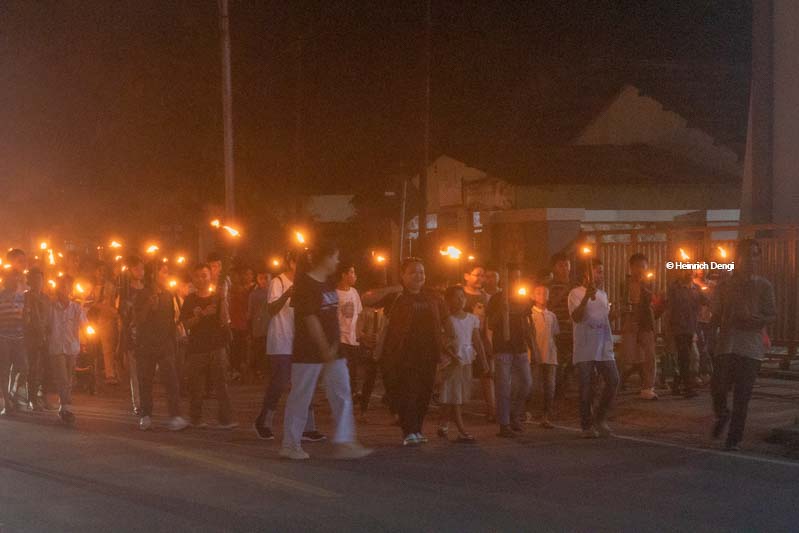 Sambil berjalan anak Sekolah minggu GKS Payeti mengangkat obor dengan tangan berjalan menelusuri rute yang sudah ditetapkan panitia.