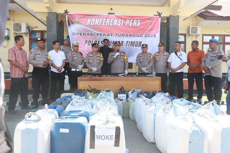 Operasi Pekat Turangga 2025 hasilkan temuan signifikan berupa 570 liter Miras Pinaraci, 1.155 liter Miras jenis Moke (dari kegiatan KRYD), serta 19 senjata tajam (17 parang Sumba, 1 pisau, dan 1 sabit). Seluruh barang bukti diamankan untuk proses hukum lebih lanjut.