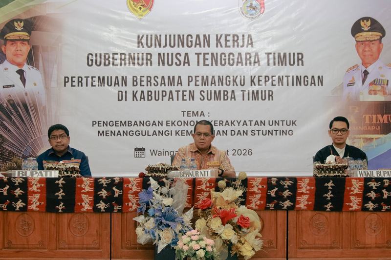 MaxFM Waingapu, SUMBA – Pemerintah Provinsi Nusa Tenggara Timur bersama Pemerintah Kabupaten Sumba Timur menggelar pertemuan strategis dengan seluruh pemangku kepentingan daerah dalam rangka mendorong pengembangan ekonomi kerakyatan sebagai solusi penanggulangan kemiskinan dan percepatan penurunan stunting. Kegiatan yang berlangsung di Gedung Nasional Umbu Tipuk Marisi ini menjadi agenda utama dalam rangkaian kunjungan kerja Gubernur NTT pada Sabtu 14 Maret 2026.